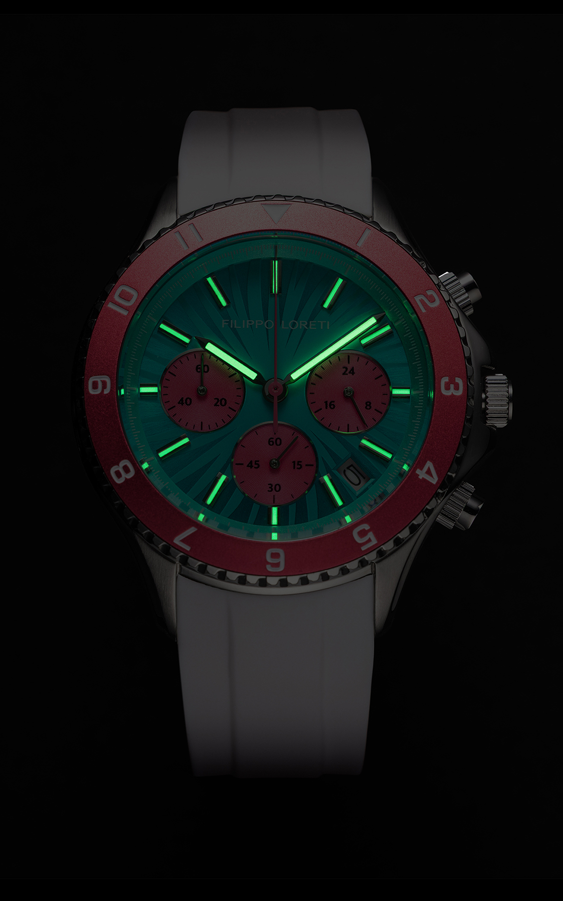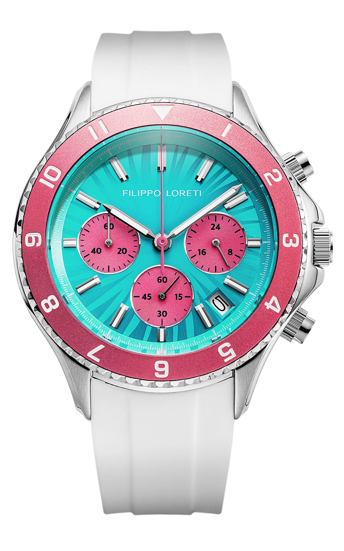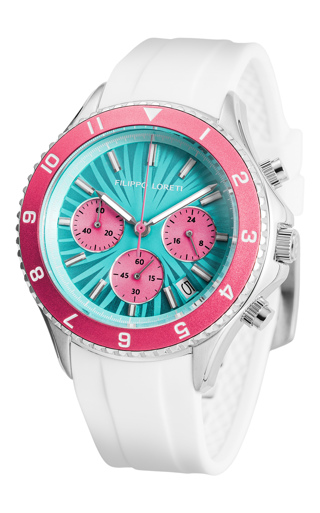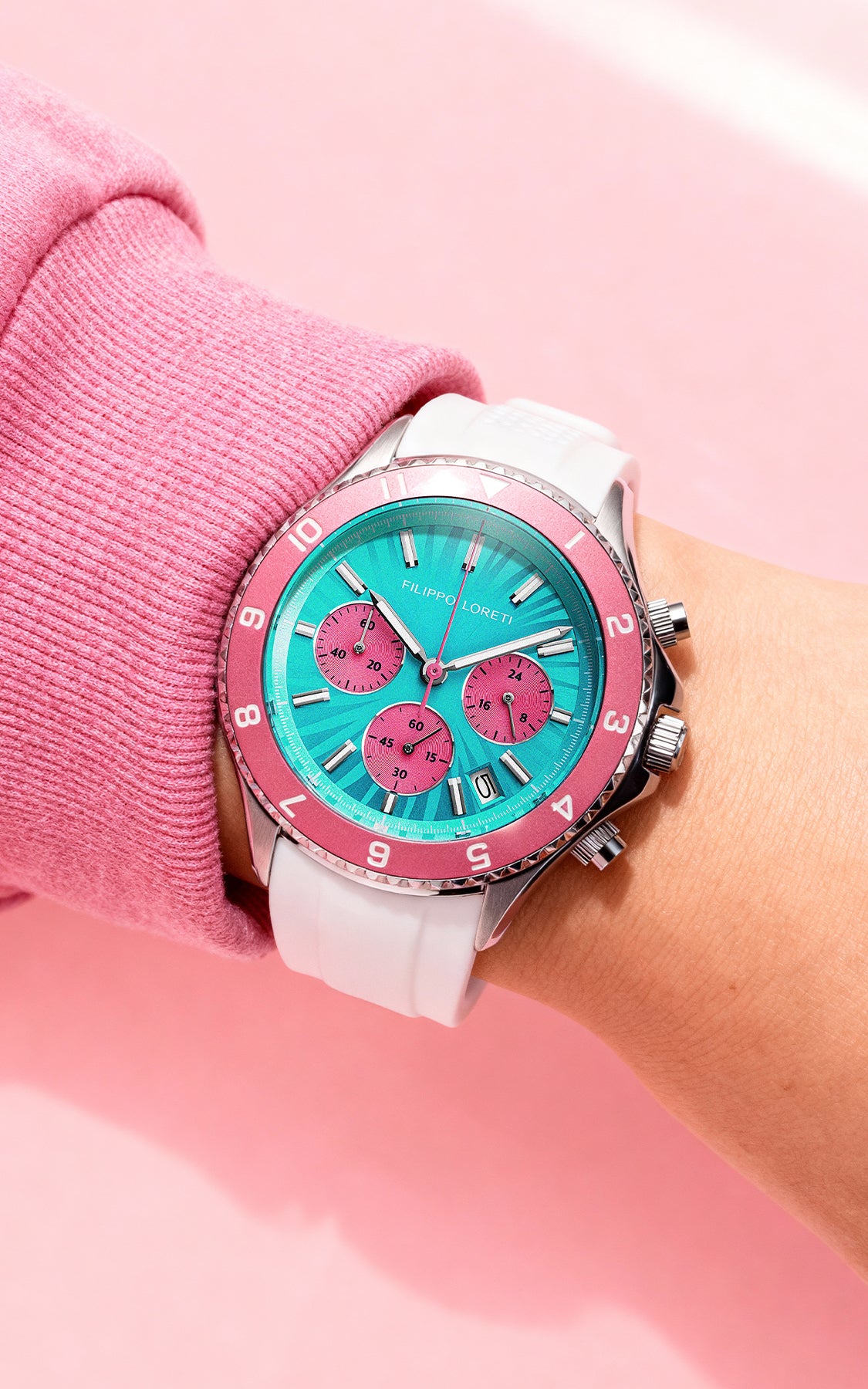 From early meetings to late-night plans, this chronograph keeps pace with your intense lifestyle. Every glance at the dial feels like a shot of energy: bright turquoise rays, pink subdials, and clean white details that echo your softer side, like neon lights reflected on ocean waves.