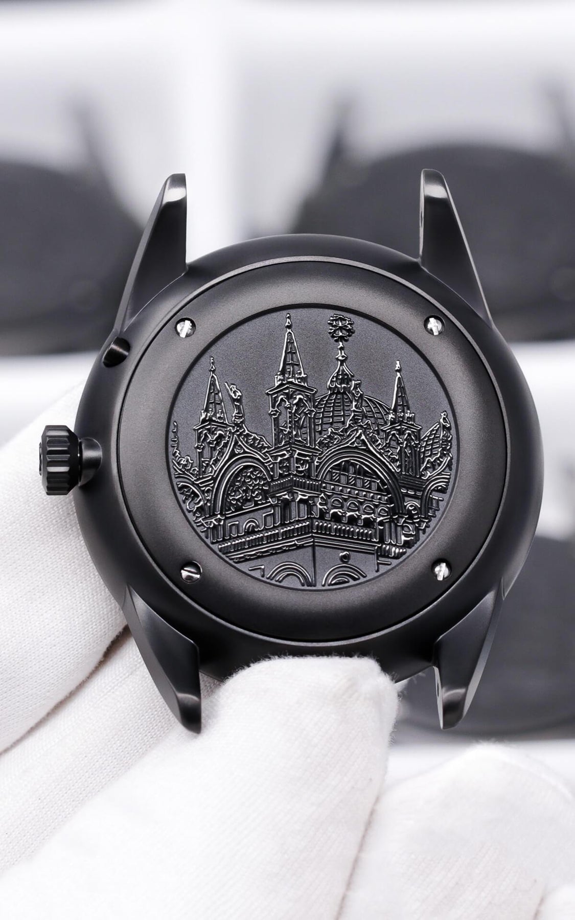 The back of every watch features an intricate engraving of the cathedral.