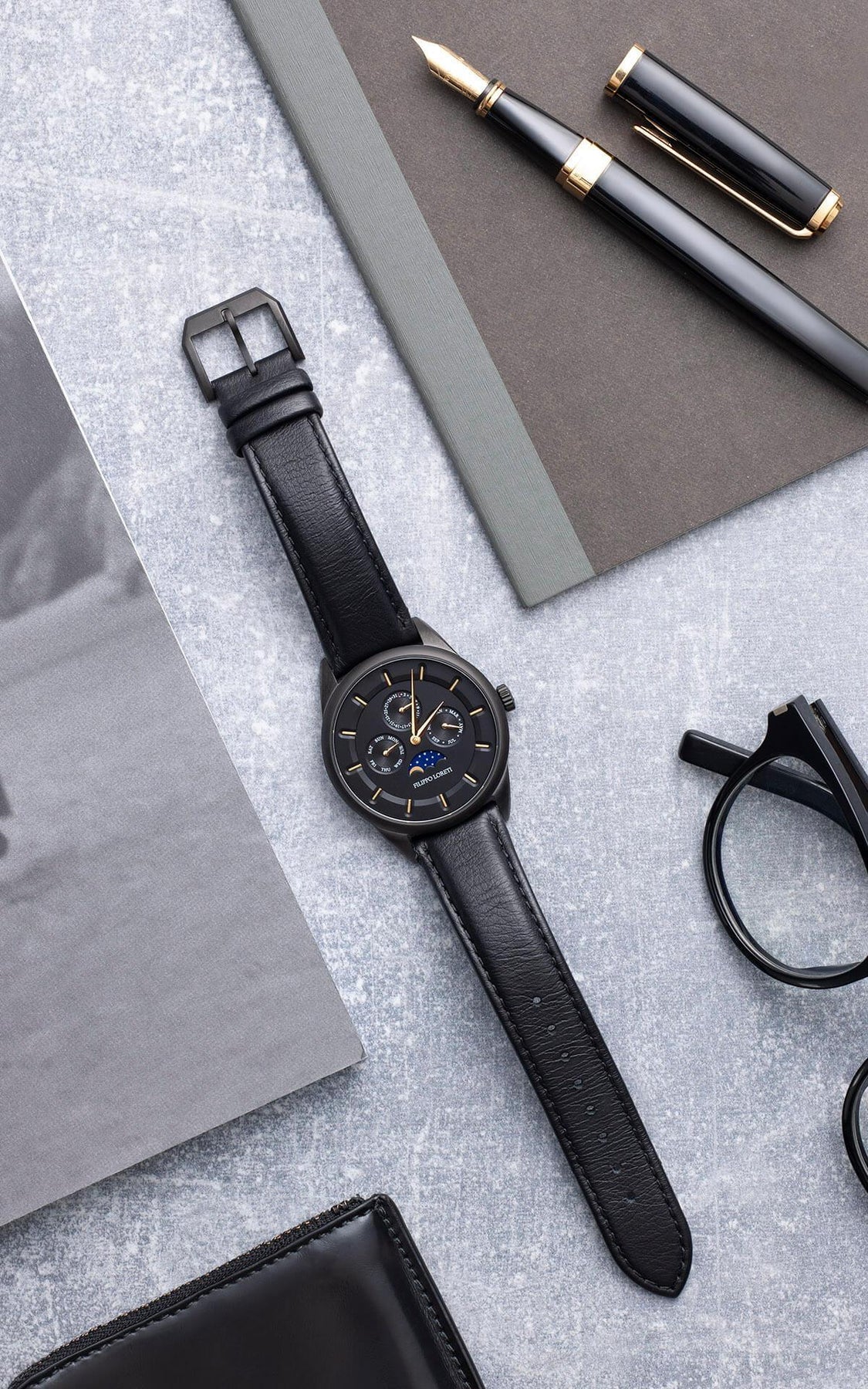 An elegant moonphase complication adds a touch of sophistication.
